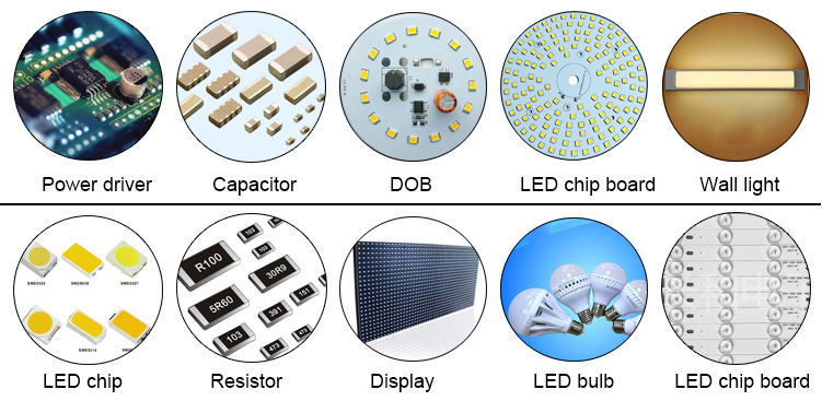 Bulb light、DOB bulb、Display、Electric board、Power driver、LED chip board、Wall light、Street light etc.